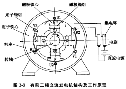 图3-9是最简单的4极交流三相发电 机工作示意图。直流电源经电刷、集 电环向磁极绕组提供直流电流(即励磁电流),根据通电线圈周围产生磁场的原理,4个磁极铁心便建立起极性分别为N、S、N、S的磁场。定子 铁心槽中分别嵌有U、V、W 三相定子绕组。发电机转子由发动机驱动,由于电磁感应作用,在定子绕组中便感应出电动势,当定、转子铁心尺寸和绕组匝数设计合理时,在额定转速下发电机可发出额定电压。