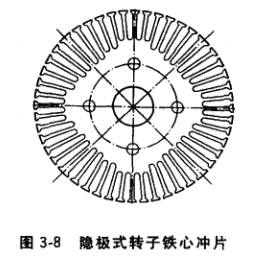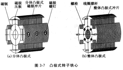 中小型交流发电机不论是单 相还是三相,其磁极铁心都可分为凸极式和隐极式两种结构。凸 极式指磁极铁心每极的极身呈凸起状,磁极绕组就套装在极身上或直接绕制在绝缘极身上。凸极式磁极铁心有分体凸极式和锒 体凸极式之分,它由如图3-7所示的凸极式磁极铁心冲片叠装而成,图3-7a为分体凸极式磁极铁心,每个极铁心套装上磁极绕组后,用磁极螺钉固定在磁轭上;图3-7b为整体凸极式磁极铁心,每个极与磁轭部分为一体,磁极绕组直接绕制在已包扎好绝缘物的极身上。国外引进技术生产的发电机都采用整体凸极式结构,其磁极绕组散热条件好,机械强度高,转子无第二气隙,减少了励磁安匝,而且阻尼绕组布置方便,斜极方便,可用斜极结构消除齿谐波。
