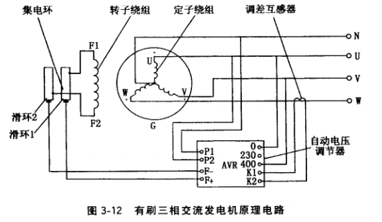 (4) 整机工作原理。有刷三相交流发电机原理电路如图3-12所示。由励磁电源输出的直流电(励磁电源可来自直流励磁机发出的直流电压、交流励磁机发出的交流电经整流成的直流电压、定子副绕组感应的电压经整流成的苜流电压、定子主绕组抽头电压经整流成的直流电压),经滑环、集电环向转子磁极绕组F1F2提供励磁电流。发电机由内燃机驱动至接近额定转速,依靠转子磁极铁心的剩磁磁场(新机或经大修的旧机须经充磁后,磁极铁心才有剩磁磁场),在定子绕组中感应出交流电。由于定子槽中嵌人的绕组按三相布置,因而感应出三相交流电压。调节磁场变阻器或自动电压调节器(AVR)的电位器,可使发电机空载电压整定在额定电压值。负载时,依靠自动电压调节器对转子励磁电流进行自动调节,以维持发电机电压恒定。未配备自动电压调节器的,则依靠手动调节磁场变阻器对转子励磁电流进行调节,以维持发电机电压接近额定值。