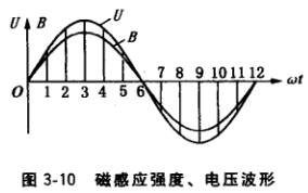 (2) 交流电的产生。交流电指的是大小和方向随时间按正弦规律作周期性变化的电流或电压。图3-9所示发电机转子顺时针方向旋转,当磁极①、②这一对N、S极掠过定子绕组U1的导线时,该绕组导线感应的电压为:磁极①极性为N,当极弧表面上的点1、2、3三 个位置先后掠过绕组U1时,该绕组感应电压方向用右手定则判定为正;磁极②极性为S, 当极弧表面上的点4、5、6三个位置先后掠过绕组U1时,该绕组感应电压方向用右手定则判定为负。由于磁极铁心极弧表面与定子铁心之间的气隙大小设计成不均匀,中央气隙小, 两侧气隙大,通过气隙大小和极靴宽度的合理选取,使沿极弧表面各处的磁感应强度按正弦曲线分布。当磁极的不同点掠过绕组U1时,该绕组感应的电压大小也按正弦曲线分布,如图3-10所示,这就是单相交流电。交流发电机的转速、磁极对数和感应的 交流电频率之间的关系式为:ƒ=Pn/60 (式中ƒ为交流电频率,n为转速,P为极对数)。在图3-9中一个N极和一个S极组成1个极对数,该发电机为4极,即2 对极。