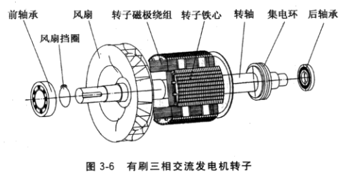 (2) 转子。转子一般由转轴、磁极铁心、磁极绕组、集电环、轴承及风扇等组成,如图 3-6所示。