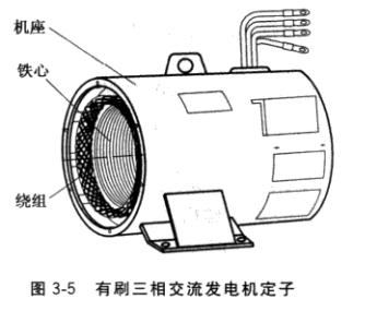 (1) 定子。定子由机座、定子铁心、定子绕组组 成,如图3-5所示。机座是发电机的整体支架,用以固定带绕组的定子铁心,并和前端盖、后端盖及轴承一道支承转子。新型发电机机座由钢板压制而成,机座内壁有沿圆周均匀分布的若干轴向筋条,用以支撑、 固定定子铁心。机座两端面加工有与端盖配合的止口及螺孔。机座下部有支撑定子及整机的底脚。机座顶 部或侧面一般装有出线盒,出线盒内装有接线板,从这里接出交流电输出引线、励磁绕组引线和定子副绕组引线。有的发电机出线盒中装有励磁调节器。
