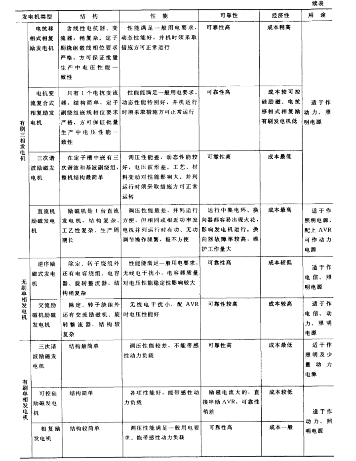 各类发电机的结构、基本性能、可靠性、经济性、用途见表3-2。