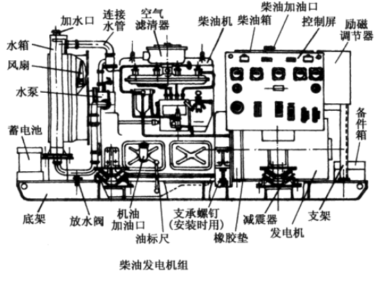 (2) 柴油发电机。发电机是使机械能转变为电能的机器。输出的有单相交流电和三相交流 电,励磁有无刷励磁。相复励、三次谐波励磁。励磁机(交、直流)励磁等方式。