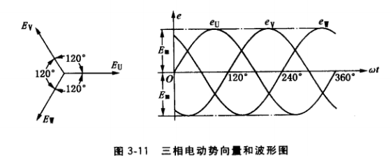 (3) 三相交流电的产生。图3-9所示发电机定子铁心梢中,沿圆周均匀安置彼此相隔 120°电角度的3个相同绕组U1U2、V1V2、W1W2,称为三相绕组。当转子旋转时,便可在三相绕组中感应出彼此相隔120°电角度的交流电动势印、eu、ev、ew,其向量和波形如图3-11 所示。