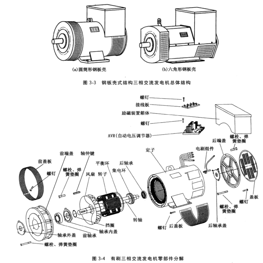 国外交流发电机总体结构儿乎都是钢板壳式,我国目前自主开发的由柴油机或汽油机驱动的中小型三相交流发电机总体结构,也越来越多采用钢板壳式,如图3-3所示。有刷三相交流发电机主要由定子、转子、端盖、轴承、出线盒等组成,其主耍零部件如图3-4所示。