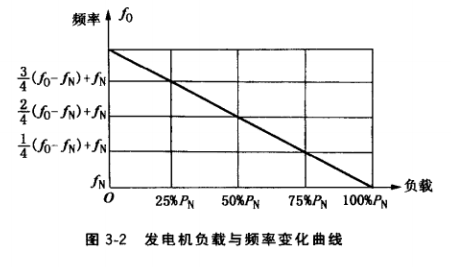 不同负载时其对应的转速从图3-2査找,图中PN为额定功率;ƒN为额定频率,其值按铭牌规定;ƒo为空载频率,其值按发动机稳态调速率规定,—般为(1 + 5%)ƒN。图3-2应用示例:发电机负载为25%PN时,在图中横坐标25%PN处引垂线交粗实线,再从该交点引纵坐标垂线,则交点数值即为与25%PN对应的频率值3/4ƒo-ƒN)+ƒN,以ƒN = 50Hz、ƒo=52.5Hz为例,求得此时应调节发动机转速使发电机频率= 3/4(52. 5-50) + 50 = 51. 875Hz。