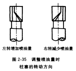 喷油量不均匀调整时,可将调节齿杆移到停止供油的位罝。用小螺丝刀旋松调节齿轮上 的锁紧螺钉再用小螺丝刀头触在油虽控制套筒的小孔中,用小手锤轻轻地敲击螺丝刀柄, 若喷油量过小,使控制套筒向左转一定角度;喷油最过大,使控制套筒向右转一定角度。转 动控制套筒来调整喷油量大小时.应根据其构造确定转动方向,如图2-35所示。调整完成 后,再做试验进行复验,各缸喷油量应接近一致为止。