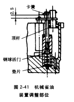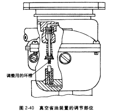 (4) 省油装置的维修。231型汽化器装有真空省油装置和机械省油装罝。真空省油装置靠真空控制,可借活塞杠杆下端3道环梢加以调节,如图2-40所示。向下调节一个环槽,等于将弹簧放松,使真空省油装置作用延迟。反之,向上挪一个环槽,等于将弹簧弹力加强,作用提早。省油装置的活塞磨损严重、弹簧折断或弹力不足时,应换新件。
