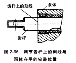 在装配调节齿杆时,齿杆上的刻线应与泵体齐平,如 图2-36所示。若向内移入过多而看不到刻线,为最大油量过大;若向外移出过多,为最大油量过小,都必须进行调整。