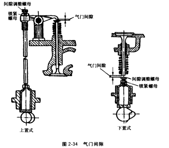 气门间隙有上置式与下置式两种,如图2-34所示。气门间隙通常是在冷机状态下进行检查和调整的。柴油机、汽油机的气门间隙在其使用说明书中均有规定。气门间隙的检查和调整方法如下: