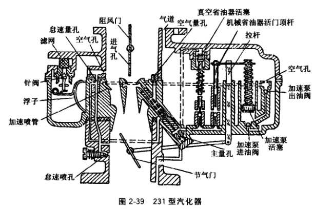汽化器的形式很多,但其结构及工作原理基本相同。下面以图2-39所示的使用较广泛的231逛汽化器为例,说明汽化器的调整和检修。