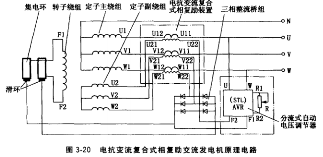 电抗变流复合式相复励三相交流发电机原理电路如图3-20所示。发电机由内燃机驱动至空载转速为额定值附近时,依靠转子铁心剩磁磁场,发电机定子副绕组感应电压经电抗变流器二次绕组的移相作用,提供一个建立发电机空载电压的交流励磁电流的电压分量Ifu经三相整流桥组整流后向发电机转子绕组提供空载励磁电流。定子主绕组经串接电抗变流器 —次绕组后输出三相电压。当发电机带上负载后,由电抗变流器的复励作用,在二次绕组感应一个与发电机负载电流相对应的交流励磁电流的电流分量Ifi,因此,负载时由Ifu和Ifi两个励磁电流分量几何叠加,并经三相整流,向转子绕组提供负载励磁电流,从而维持发电机端电压恒定。不可控复合式相复励发电机稳态电压调整率一般不大于±5%。
