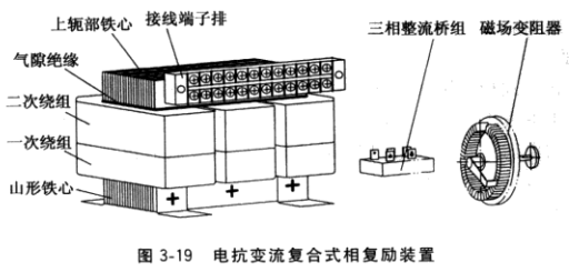 这种发电机在图3-4所示有刷三相交流发电机基本结构基础上配置一套电抗变流复合式相复励装置,其外形如图3-19所示,它包括电抗变流器、三相整流桥组和磁场变阻器。作为可控相复励装置,还必须外配加装一个分流式自动电压调节器(STL)小功率发电机可不配分流式自动电压调节器,电压性能可满足使用要求。