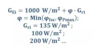 TÜV莱茵内部标准2PfG 2645/11.17 中规定可以使用IEC 60904-1-2中的单面辐照和双面辐照测试方法,不过目前在TÜV莱茵的实验室中使用的是单面辐照测试方法。除了BSTC下的测试,背面辐照度 (Gri) 为100W/sqm 和 200 W/sqm 时的IV测试结果也可以作为补充信息在测试报告中提供。 如下图所示,单面辐照测试方法首先对双面组件正反两面分别在STC条件下进行功率测试,然后再测试组件正面在等效辐照度(GEi)下的光伏特性。等效辐照度(GEi)由以下公式计算得出: