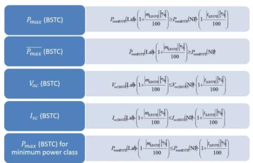根据国际标准IEC 61215:2016的规定,光伏组件在进行任何进一步的测试之前都必须先稳定其电性能。对于双面组件,光致衰减(LID)等问题依然存在并且不可忽视。因此,TÜV 莱茵2PfG 2645/11.17 建立了一套对BSTC下测得的光伏数据进行铭牌验证的体系,该体系对于Pmax、Pmax 的平均值、 Voc 以及 Isc 的判定要求和 IEC 61215-1:2016中的一致。 并且该体系中增加了对于最低功率档组件在BSTC下的 Pmax 的额外要求来保证最低功率档组件的质量。具体要求如下: