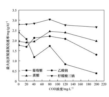 实验进水NH4+-N和NO2--N浓度分别为80 mg˙L-1和120 mg˙L-1.考察4种有机物葡萄糖、蔗糖、乙酸钠、柠檬酸三钠在COD浓度梯度0、20、40、80、120、200 mg˙L-1时对厌氧氨氧化反应的影响.