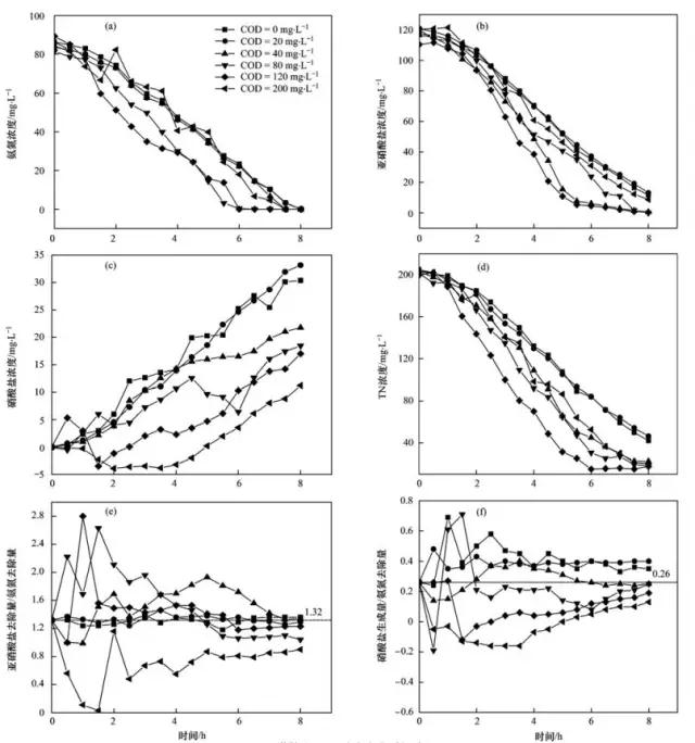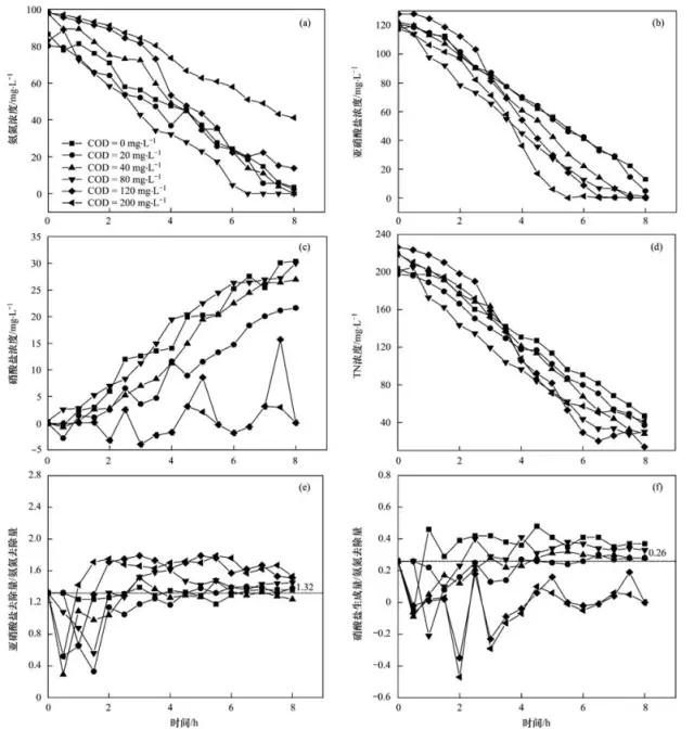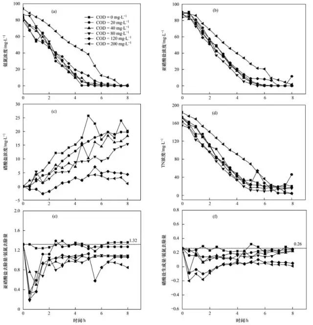 从图 6(e)、6(f)中可以看出当蔗糖浓度大于40 mg˙L-1时,NO2--N与NH4+-N去除量的比值先升高后降低最后接近理论值,而NO3--N生成量与NH4+-N去除量的比值正好相反先降低后升高然后逐渐接近于理论值,而且NO2--N与NH4+-N的比值先升高或NO3--N与NH4+-N的比值先降低的过程随着蔗糖浓度的升高逐渐变短.这一过程与之前葡萄糖和乙酸钠不同,可能是因为蔗糖更容易被反硝化菌代谢.随着反应的进行,系统中有机物被消耗,反硝化作用受到抑制,NO2--N去除量/NH4+-N去除量与NO3--N产生量/NH4+-N去除量的值逐渐接近理论值.