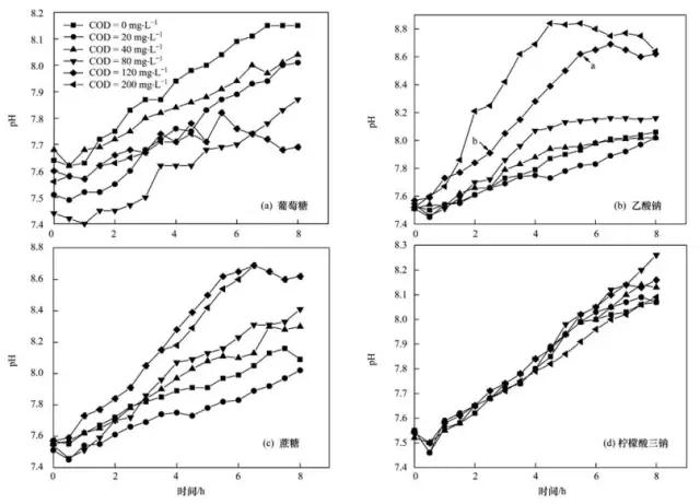 图 9 不同有机物作用下厌氧氨氧化系统pH值的变化曲线
