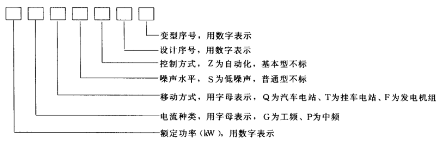 变型序号,用数字表示 设计序号,用数字表示 控制方式,Z为自动化。基本型不标 噪声水平,S为低噪声。普通型不标。移动方式。用宇母表示,Q为汽车电站、T为挂车电站、F为发电机组。电流种类,用字母表示,G为工频、P为中频 。额定功率(kW ),用数宇表示例如。 20GF7-8柴油发电机组,表示额定功率为20kW的工频(50Hz)柴油发电机组 的第七种形式,第八次变型; 50GFSZ1-2柴油发电机组,表示额定功率为50kW工频低噪 声自动化柴油发电机组,第一种形式,第二次变型。单相和H相发电机组型号制编方法一 样,只是技术规格方面有所区别。
